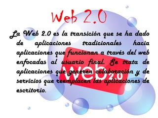 La Web 2.0 representa la evolución de la web de portales estáticos a un entorno más interactivo donde los usuarios comparten y colaboran mediante aplicaciones como blogs, crowdsourcing, redes sociales, videos, documentos, música y wikis. Estas aplicaciones permiten el intercambio de información de forma interactiva entre los usuarios.