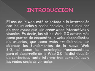 El documento habla sobre los fundamentos de la Web 2.0, la cual promueve que el flujo de información dependa del comportamiento de los usuarios permitiéndoles participar en la clasificación y construcción de contenidos a través de herramientas fáciles. Explica tecnologías como AJAX, feeds, tags, web services, RSS, APIs, wikis y blogs que facilitan la interacción y distribución de contenidos entre usuarios.
