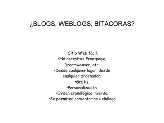 El documento describe los blogs como sitios web fáciles de crear y personalizar que permiten el intercambio de información y comentarios entre usuarios de manera gratuita y desde cualquier lugar. También explica que la Web 2.0 promueve que los usuarios participen en la clasificación y construcción de contenidos a través de herramientas intuitivas.