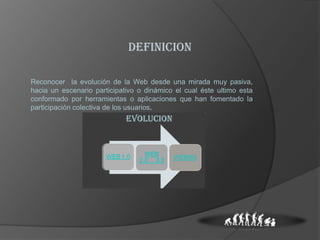 Este documento describe la evolución de la Web 1.0 pasiva a la Web 2.0 participativa, que permite la colaboración colectiva de usuarios a través de herramientas como redes sociales. También discute cómo la Web 2.0 se ha integrado en todos los ámbitos de la sociedad y cómo las nuevas generaciones son nativos digitales de esta Web Social. Finalmente, contrasta las diferencias entre la Web 1.0 unidireccional y centralizada frente a la Web 2.0 bidireccional y descentralizada.