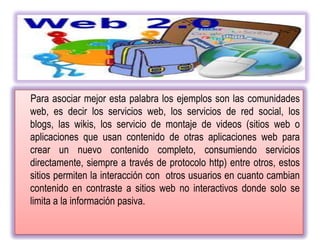 La Web 2.0 se refiere a aplicaciones y páginas web interactivas que facilitan la comunicación y colaboración entre usuarios. Estas aplicaciones como blogs, wikis y redes sociales permiten que los usuarios interactúen y compartan contenido en lugar de solo recibir información pasiva. La Web 2.0 no es una tecnología en sí misma, sino una actitud que promueve la participación de los usuarios.