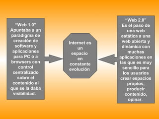 El documento describe la evolución de la Web 1.0 a la Web 2.0, la cual permite una web más abierta y dinámica donde los usuarios pueden crear fácilmente su propio contenido y opinar. Los principios clave de la Web 2.0 incluyen el uso de la World Wide Web como plataforma de trabajo, la inteligencia colectiva, el manejo de bases de datos y software ligero que brinda experiencias enriquecedoras para los usuarios.