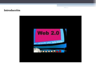 Este documento trata sobre la Web 2.0. Explica que la Web 1.0 tenía información de solo lectura mientras que la Web 2.0 permite la interacción y colaboración de los usuarios a través de blogs, wikis, redes sociales y otros recursos. También describe cómo la Web 2.0 apoya un aprendizaje más activo e interactivo donde los estudiantes pueden crear y compartir contenidos.