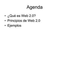 El documento describe Web 2.0 y su importancia para los negocios. Explica que Web 2.0 se refiere a aplicaciones que permiten la interacción entre personas, contenido y datos. Detalla los principios de Web 2.0 como fomentar la inteligencia colectiva y mejorar la experiencia del usuario. Además, presenta ejemplos populares de aplicaciones Web 2.0 como Wikipedia, Flickr y YouTube.