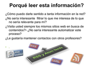 Este documento describe varias herramientas de la Web 2.0 como RSS, folksonomías, etiquetas, wikis, redes sociales, presentaciones y videos que pueden usarse para filtrar y compartir información de manera personalizada y colaborativa, y sugiere que los educadores deben capacitarse en estas herramientas digitales para preparar a los estudiantes para el futuro.