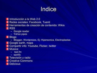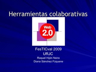 Este documento presenta una introducción a las herramientas colaborativas de la Web 2.0, incluyendo redes sociales como Facebook y Tuenti, wikis, blogs, herramientas de compartir contenido como YouTube y Flickr, y licencias como Creative Commons. Explica las características de la Web 2.0 como contenido creado por usuarios y arquitectura participativa, y proporciona enlaces a ejemplos populares de estas herramientas.