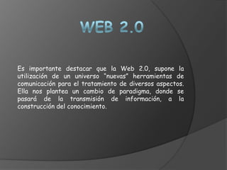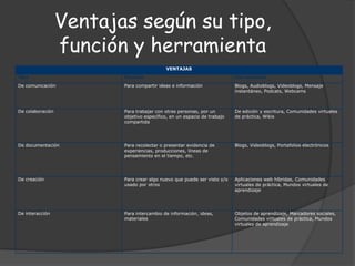 Este documento describe las ventajas y desventajas de la Web 2.0 para la comunicación y el aprendizaje. Presenta tablas que detallan los tipos de herramientas de la Web 2.0, sus funciones y ventajas. También identifica tres factores clave que representan desventajas: el factor formativo se refiere a la falta de capacitación de los profesores en nuevas tecnologías; el factor actitudinal incluye actitudes como la preferencia por lo tradicional; y el factor institucional alude a problemas como equipamiento insuficiente