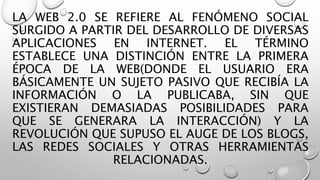 El documento describe la Web 2.0 y sus principales características. La Web 2.0 se refiere al fenómeno social surgido a partir del desarrollo de aplicaciones que permiten la interacción entre usuarios y la generación de contenido. Está formada por plataformas como blogs, redes sociales y servicios de alojamiento de contenidos que permiten publicar y compartir información. Algunos ejemplos son Facebook, Wikipedia, Flickr y YouTube.