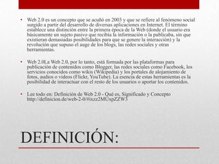 El documento describe varias herramientas de la Web 2.0 que pueden utilizarse con fines educativos, como blogs, presentaciones en línea, podcasts, wikis, redes sociales y herramientas para crear mapas conceptuales, diarios en línea y libros de fotos. Estas herramientas permiten publicar, compartir y colaborar en contenidos de varios tipos como texto, imágenes, audio y video.