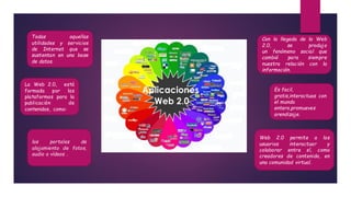 La Web 2.0 se refiere a las utilidades y servicios de Internet que se basan en bases de datos y permiten a los usuarios interactuar y colaborar como creadores de contenido en plataformas como portales de alojamiento de fotos, audio o videos; con la llegada de la Web 2.0, se produjo un cambio social que transformó para siempre nuestra relación con la información al hacerla más fácil, gratuita e interactiva a nivel mundial.