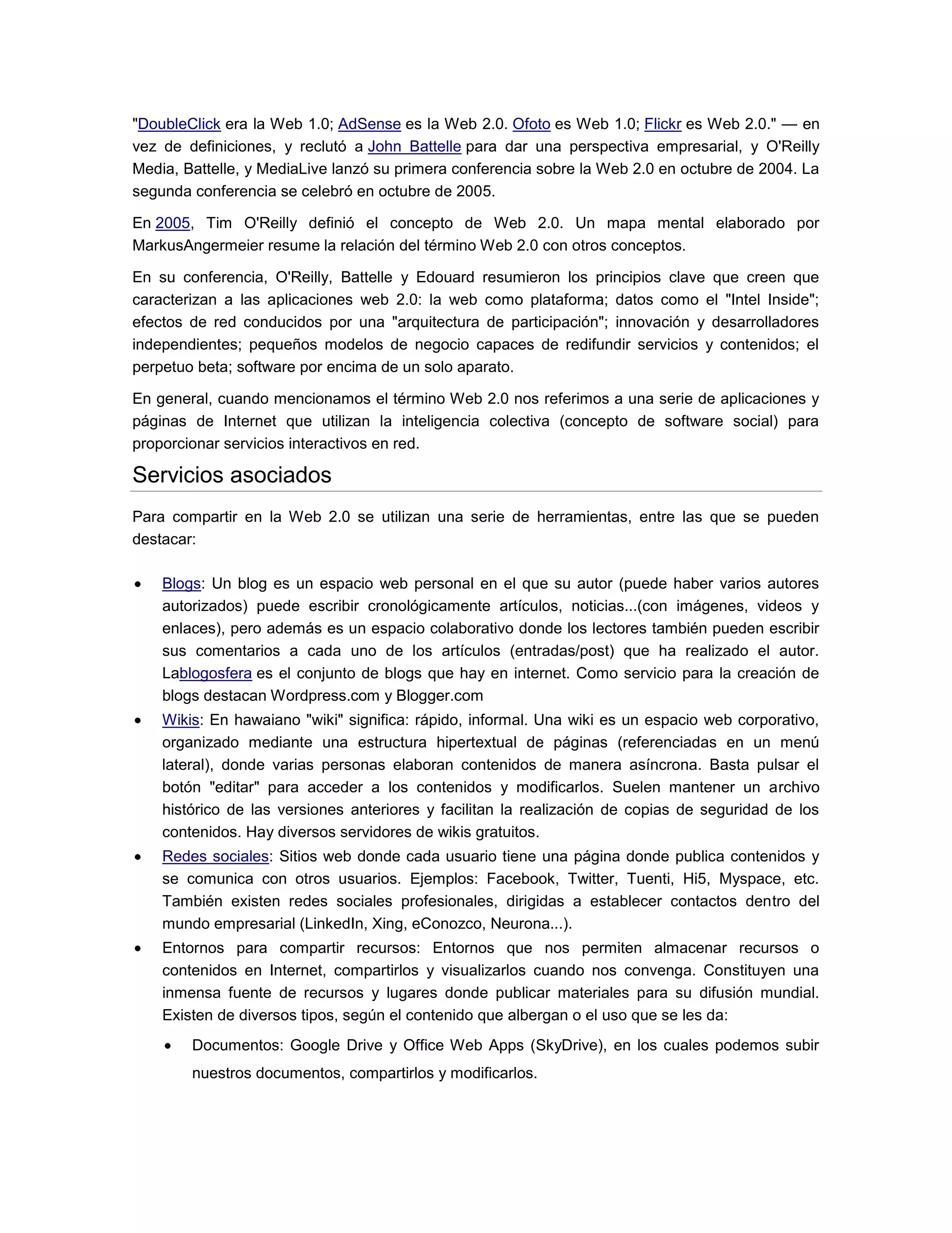 El documento describe la evolución de la World Wide Web desde su creación hasta la actualidad. Explica que la Web 2.0 se caracteriza por permitir a los usuarios interactuar y colaborar generando contenido, a diferencia de las primeras webs estáticas. También menciona ejemplos como blogs, wikis y redes sociales como características clave de la Web 2.0.