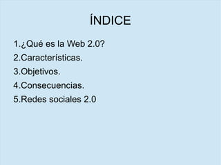 Este documento describe la Web 2.0, incluyendo sus características principales como ser una plataforma social, participativa y flexible que permite el acceso a contenidos digitales. Explica que la Web 2.0 representa la evolución de aplicaciones enfocadas al usuario final y no es una tecnología en sí misma. También resume los objetivos del documento relacionados con el uso didáctico de Internet y las redes sociales 2.0.