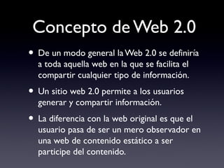 La Web 2.0 permite a los usuarios generar y compartir información de forma activa. Ofrece ventajas como el aprendizaje participativo y acceso inmediato a información, pero también riesgos como la falta de fiabilidad de algunas fuentes. Plataformas como blogs, wikis, podcasts y YouTube son pilares clave, al igual que sistemas virtuales de aprendizaje que facilitan el acceso a contenidos y la evaluación.