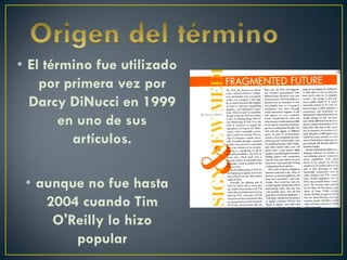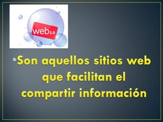 El documento habla sobre la Web 2.0, un término acuñado en 1999 que se popularizó en 2004 y que se refiere a sitios web que permiten a los usuarios interactuar y colaborar generando contenido, como comunidades en línea, redes sociales, wikis y blogs. La Web 2.0 representa la transición de aplicaciones de escritorio a aplicaciones en línea centradas en el usuario final que fomentan la colaboración.