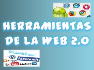 La web 2.0 se refiere a las herramientas interactivas y colaborativas disponibles en la web actual que permiten a los usuarios participar como creadores y consumidores de contenido. Algunas de estas herramientas incluyen blogs, redes sociales, wikis, marcadores sociales, podcasts, videos, correo electrónico y paneles de inicio personalizables. El documento proporciona ejemplos específicos de herramientas populares dentro de cada categoría.