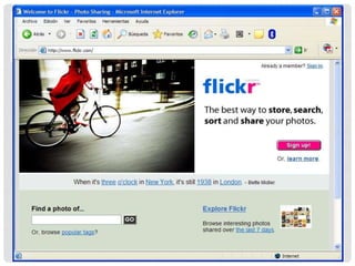 El documento describe varias aplicaciones para la Web 2.0 como YouTube, Instagram y Flickr, que permiten compartir videos e imágenes y dejar comentarios. También menciona sitios web como Complexify y la página del Banco de la República que pertenecen a la Web 1.0 y tienen funcionalidades limitadas o anticuadas.