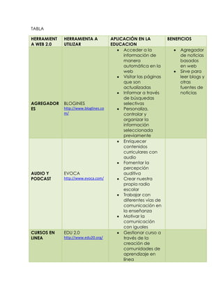 La Web 2.0 permite a los usuarios crear, modificar y compartir información en línea de manera colaborativa. Esto puede fomentar un aprendizaje colaborativo y proporciona acceso a una gran cantidad de información para simular situaciones del mundo real. Sin embargo, se necesitan competencias digitales y sociales para que los estudiantes puedan acceder y construir conocimiento de manera autónoma en este entorno.