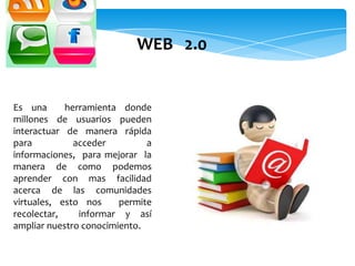 Web 2.0 es una herramienta que permite a millones de usuarios interactuar rápidamente para acceder e intercambiar información y mejorar la forma en que aprendemos sobre comunidades virtuales. Algunas herramientas clave de Web 2.0 incluyen blogs, wikis, mapas mentales y herramientas de presentación en línea que permiten la colaboración y el trabajo en equipo. Aunque requiere recursos técnicos, Web 2.0 promueve un aprendizaje más constructivo y colaborativo al romper los límites del a