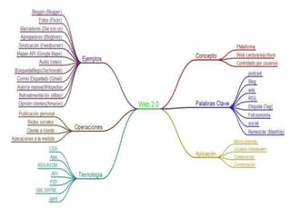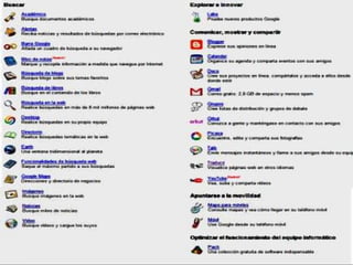 El documento describe la evolución hacia la web 2.0, resaltando su enfoque en aplicaciones que fomentan la colaboración y el acceso del usuario final. Se mencionan servicios de Google como Google Docs, Picasa, Google Calendar y Blogger, explicando sus características y funcionalidades. Además, se señala la importancia de RSS como un formato para distribuir contenido actualizado sin necesidad de un navegador.