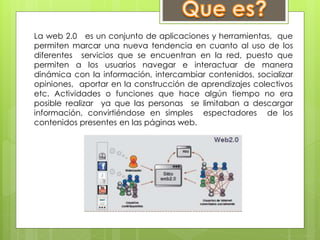 La web 2.0 permite a los usuarios interactuar dinámicamente con la información en línea, intercambiar contenidos y opiniones, y contribuir al aprendizaje colectivo, a diferencia de la web original donde los usuarios solo podían descargar información. La web 2.0 se basa en 7 principios como aprovechar la inteligencia colectiva y gestionar bases de datos. Existen miles de herramientas web 2.0 clasificadas en categorías como blogs, redes sociales, video y wikis. La salud 2.0 es una forma de asistencia sanitaria