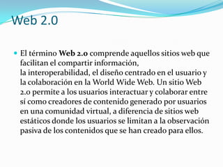 El documento habla sobre la Web 2.0 y sus características. Define la Web 2.0 como sitios que facilitan el compartir información y la colaboración entre usuarios, permitiendo que estos sean creadores de contenido. Da ejemplos como redes sociales, blogs y wikis. Explica que la Web 2.0 permite el trabajo colaborativo y mejora las herramientas educativas, pero también conlleva riesgos de seguridad y problemas legales sobre la propiedad del contenido generado por los usuarios.