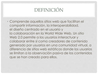 La Web 2.0 se refiere a sitios web que facilitan la interacción y colaboración entre usuarios para crear y compartir contenido generado por los usuarios. Algunas características clave incluyen el uso de blogs, redes sociales, wikis y entornos para compartir recursos. La Web 2.0 fomenta la participación activa de los usuarios más allá de simplemente observar contenido.
