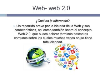 Este documento proporciona información sobre la web y la web 2.0. Explica que la web fue creada por Tim Berners-Lee a finales de los años 80 como un sistema hipertextual para compartir información. La web 2.0 se refiere a las nuevas posibilidades de relaciones sociales a través de Internet, como publicar y compartir contenido generado por usuarios a través de servicios como Blogger, Facebook y Twitter. La principal diferencia es que la web 2.0 no es una evolución de la web, sino una forma de utilizar sus posibilidades para la comunic