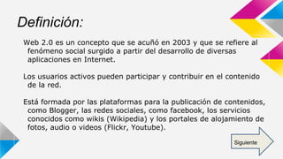 La Web 2.0 se refiere al fenómeno social surgido a partir del desarrollo de aplicaciones que permiten a los usuarios participar activamente y contribuir al contenido de la red a través de plataformas como blogs, redes sociales, wikis y portales de alojamiento de fotos, audio o videos. Las características clave incluyen la participación del usuario como contribuidor activo y el auge de blogs, redes sociales y contenido agregado por los usuarios. Los servicios asociados son blogs, wikis, redes sociales y entornos para compart