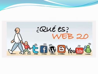 La Web 2.0 se refiere a la segunda generación de la Web que se basa en la participación de los usuarios y servicios como redes sociales, blogs y wikis que fomentan la colaboración y el intercambio de información entre los usuarios. La Web 2.0 permite que los usuarios dejen de ser pasivos y se conviertan en participantes activos que contribuyen contenido. Algunas características clave incluyen aplicaciones web que no requieren instalación, contenido generado por los usuarios y diseño accesible.