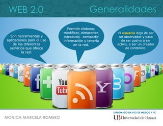 El documento describe las características y ejemplos de la Web 2.0. La Web 2.0 permite a los usuarios crear y compartir contenido en línea fácilmente usando herramientas como wikis, blogs, redes sociales y más. Los usuarios ya no son solo observadores, sino que pueden participar activamente editando y publicando contenido para que otros lo vean. La Web 2.0 también puede usarse para fines educativos donde los estudiantes pueden colaborar y construir conocimiento juntos.