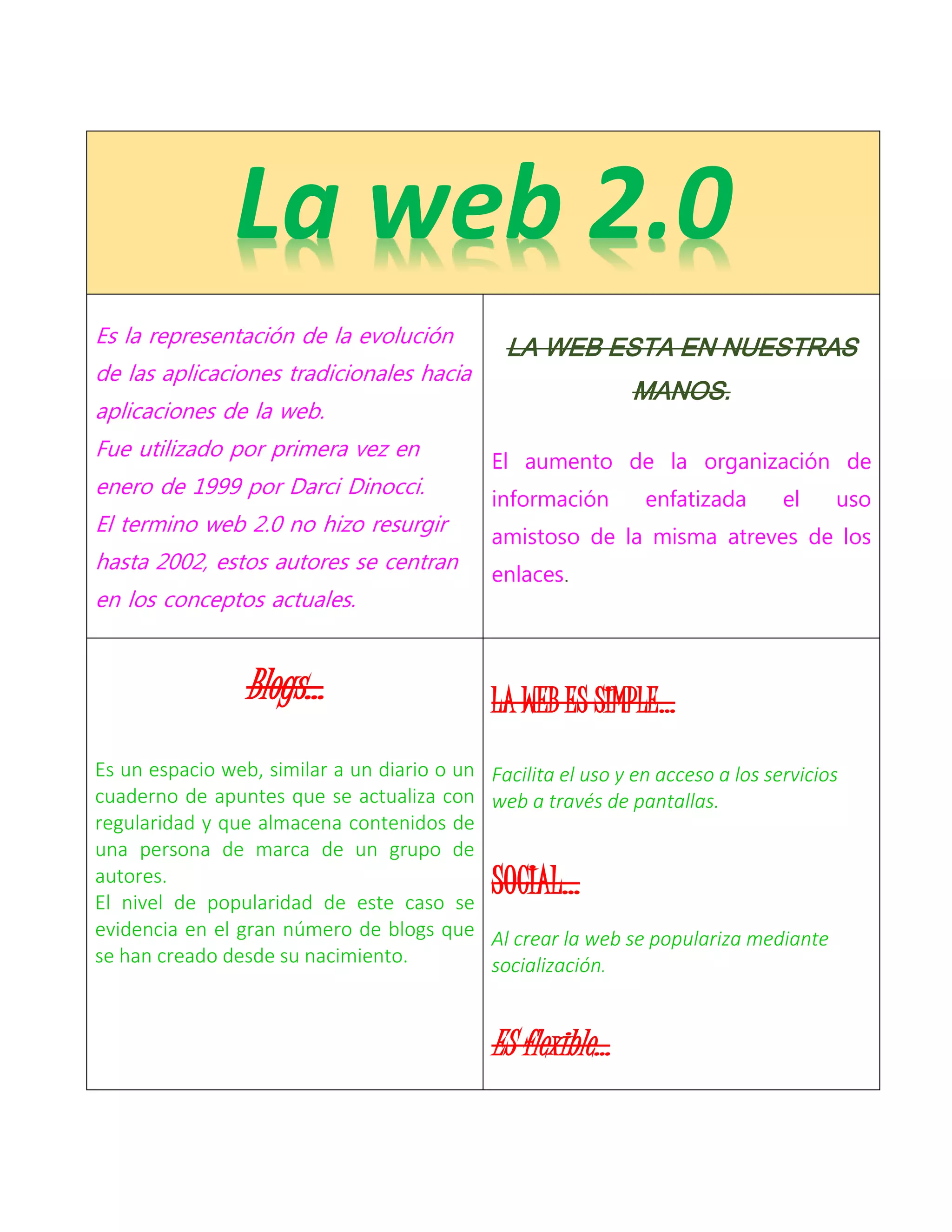 La web 2.0 representa la evolución de las aplicaciones tradicionales a aplicaciones web. El término fue acuñado en 1999 pero no se popularizó hasta 2002, cuando los autores se centraron en conceptos como la organización de información a través de enlaces y herramientas como blogs y redes sociales que facilitan el acceso y compartir contenidos. La web 2.0 es más simple, social y flexible al permitir el acceso a contenidos digitales.
