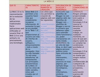 La Web 2.0 permite a los usuarios crear y compartir contenido en línea fácilmente a través de blogs, redes sociales y otros sitios creados por usuarios. El documento explora las características de la Web 2.0 como Blogger y WordPress y los términos y condiciones de su uso.