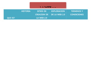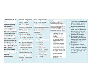 El documento describe la evolución de la Web 2.0, en la que los usuarios dejan de ser pasivos y se convierten en participantes activos que contribuyen contenido. La Web 2.0 utiliza la inteligencia colectiva y herramientas como blogs, wikis, redes sociales y compartir fotos y videos para que los usuarios creen y agreguen valor al contenido de manera colaborativa.