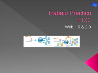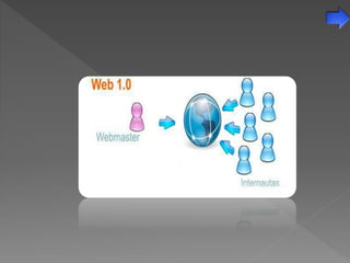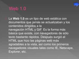 La Web 1.0 se caracteriza por páginas web estáticas con contenido fijo que rara vez se actualizaba. Incluía elementos como páginas creadas de forma fija, uso de marcos, botones GIF y formularios enviados por correo electrónico. La Web 2.0 representa la evolución hacia usuarios activos que participan y contribuyen contenido dinámico a través de blogs, redes sociales, contenido generado por usuarios y etiquetado colectivo.
