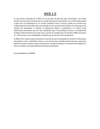 La Web 2.0 permite la interacción con información propia y ajena de forma fundamental en un mundo cambiante, al tiempo que protege los derechos de autor. Esta versión mejorada de la Web 1.0 es muy útil en la vida universitaria ya que proporciona información actualizada y veraz que puede ayudar a los estudiantes a alcanzar sus metas de formarse como administradores de empresas con ética y emprendimiento.