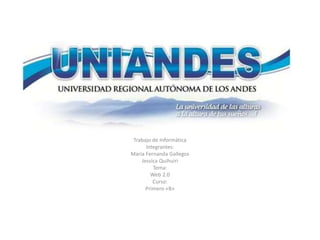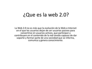 La Web 2.0 permite a los usuarios participar activamente en la creación y edición de contenido en línea. Se utiliza comúnmente en la educación superior para apoyar métodos de enseñanza participativos como el aprendizaje colaborativo. Si bien puede promover el aprendizaje autónomo, también plantea desafíos en la implementación. Las herramientas Web 2.0 tienen ventajas como la accesibilidad desde cualquier lugar y dispositivo, pero también riesgos como la pérdida de contacto personal entre estudiantes y profesores.