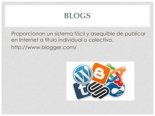 Este documento describe diferentes herramientas de la Web 2.0 como blogs, wikis, sistemas de gestión de contenidos, plataformas de e-learning, almacenamiento de imágenes y vídeos, ofimática en línea, marcadores sociales, presentaciones y podcasts; y propone su uso para buscar información, presentar temas de forma tecnológica, y compartir contenidos a través de blogs.