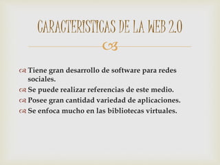 La Web 2.0 se caracteriza por su desarrollo de software para redes sociales y aplicaciones variadas. Se define como un aula virtual que permite a los usuarios interactuar y compartir información de manera colaborativa. Algunas herramientas clave de la Web 2.0 incluyen blogs, redes sociales, YouTube y Wikipedia.
