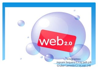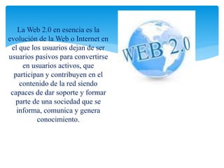 La Web 2.0 es la evolución de la Web tradicional en la que los usuarios dejan de ser pasivos y se convierten en activos, participando y contribuyendo al contenido de la red. Se caracteriza por ser participativa y colaborativa, con los usuarios creando y compartiendo contenido. La Web 2.0 integra medios, usuarios, servicios y herramientas, y permite el acceso abierto a datos, la transformación de datos en información y la creación colaborativa de conocimiento. Algunos ejemplos de aplicaciones Web 2.0 son Wikipedia, Flickr,