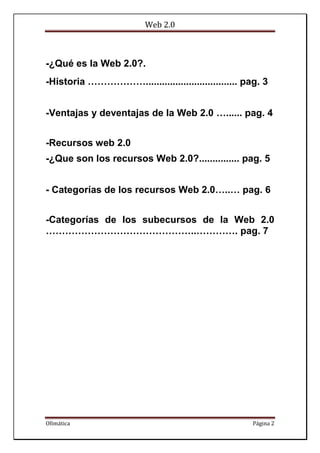 El documento proporciona información sobre la Web 2.0. Explica que la Web 2.0 permite una mayor interacción entre usuarios y la generación de contenido, a diferencia de la Web 1.0 donde los usuarios eran principalmente espectadores. También describe algunas ventajas clave de la Web 2.0 como la cooperación entre usuarios y la disponibilidad de aplicaciones en línea. Finalmente, enumera varias categorías populares de recursos Web 2.0 como blogs, redes sociales y almacenamiento en la nube.