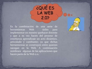 Este documento describe algunas herramientas clave de la Web 2.0 como foros, chats, Wikipedia, YouTube, RSS, Flickr, bookmarks y blogs y cómo pueden usarse en educación, incluyendo búsqueda de información, compartir contenido, análisis de videos e imágenes, y creación de contenido educativo.
