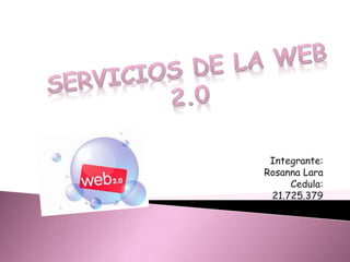 La Web 2.0 se refiere a una nueva generación de la red que se basa en permitir que los usuarios creen y compartan contenido de manera dinámica y de fácil uso a través de páginas web. Algunos de los principales servicios de la Web 2.0 incluyen blogs, wikis, redes sociales como Facebook y Twitter, y plataformas de almacenamiento como Google Drive y YouTube, donde los usuarios pueden publicar, comentar e intercambiar información personal de manera asíncrona.