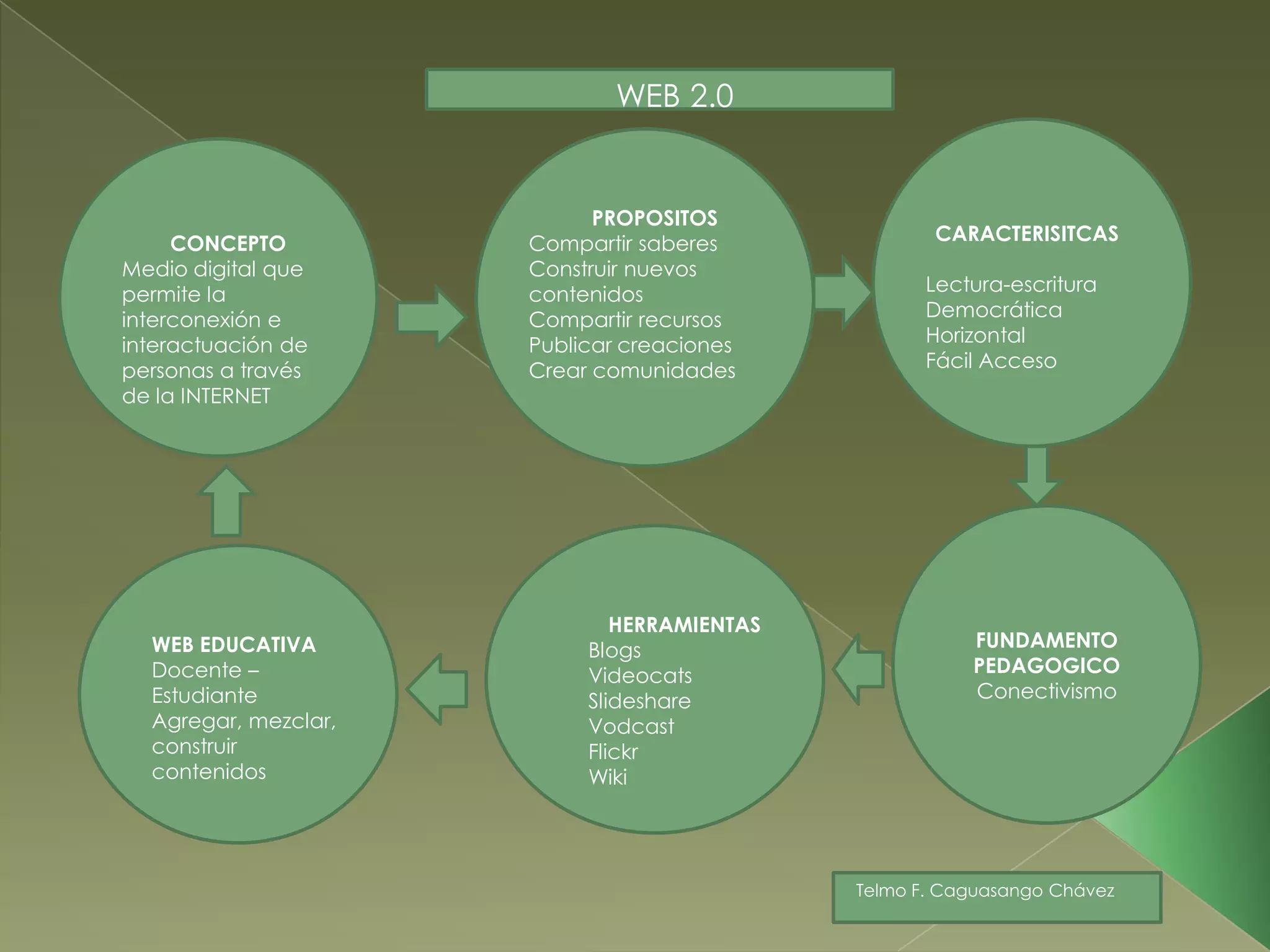 El documento describe las características y propósitos de la Web 2.0, la cual permite la interconexión e interacción entre personas a través de Internet mediante el uso de herramientas como blogs, videos, presentaciones y wikis. La Web 2.0 se basa en el conectivismo y tiene como objetivos compartir conocimientos, crear contenido de forma colaborativa, compartir recursos y construir comunidades.
