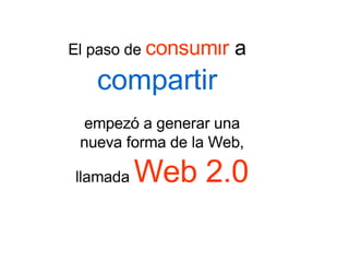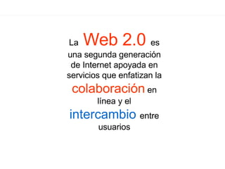 La Web 2.0 es la segunda generación de la Web basada en plataformas que permiten la colaboración y el intercambio de información entre usuarios a través de wikis, blogs, redes sociales y otros servicios. Estos servicios fomentan aprender interactuando, compartiendo y buscando información. Algunos ejemplos de sitios Web 2.0 son Facebook, YouTube, Flickr y SlideShare.