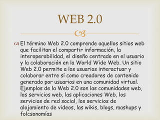 El documento describe las características de la Web 2.0, que permite a los usuarios interactuar y colaborar como creadores de contenido en comunidades virtuales. Algunas características clave son el auge de los blogs y las redes sociales, el contenido agregado por los usuarios, y el etiquetado colectivo. La Web 2.0 también se caracteriza por aplicaciones web dinámicas y por considerar la World Wide Web como una plataforma.