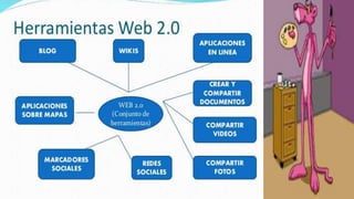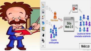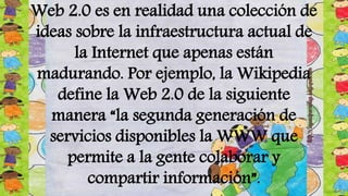 El documento describe la evolución de la Web 2.0, la cual permite a los usuarios colaborar y compartir información de manera dinámica e interactiva. La Web 2.0 convierte a los lectores en lectores-escritores y ha dado lugar a nuevas plataformas como blogs, wikis y redes sociales donde los usuarios aportan y modifican contenidos colectivamente.