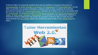 El documento describe la Web 2.0 y sus características principales como facilitar el compartir información y la colaboración entre usuarios. La Web 2.0 permite a los usuarios interactuar y crear contenido juntos en comunidades virtuales utilizando herramientas como wikis, blogs y redes sociales. Aunque el término sugiere una nueva versión de la Web, realmente se refiere a cambios en cómo los desarrolladores y usuarios usan la Web de forma colaborativa.