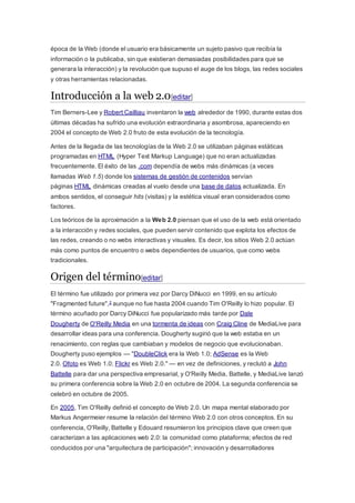 El documento describe la Web 2.0, la cual permite a los usuarios interactuar y colaborar como creadores de contenido en comunidades virtuales. Algunas características clave son permitir el compartir de información, la interoperabilidad, el diseño centrado en el usuario y la colaboración. Ejemplos como blogs, wikis, redes sociales y servicios de alojamiento de videos permiten a los usuarios participar de manera activa en lugar de ser solo espectadores pasivos.