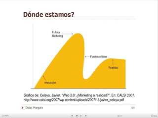 Este documento explora los conceptos de Web 2.0 y Biblioteca 2.0. Discuten las diferencias entre Web 1.0 y Web 2.0, con Web 2.0 enfocándose en aprovechar la inteligencia colectiva y participación de los usuarios. Siete principios constitutivos de las aplicaciones Web 2.0 son descritos, incluyendo usar la Web como plataforma y experiencias enriquecedoras para los usuarios. Se analizan aplicaciones como blogs, wikis, Flickr y Delicious, y cómo estas permiten la generación y distribución del conocimiento