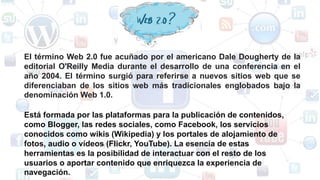 El término Web 2.0 fue acuñado en 2004 para referirse a nuevos sitios web que permitían la interacción entre usuarios y el aporte de contenido, a diferencia de los sitios tradicionales de la Web 1.0. La Web 2.0 incluye plataformas para publicar contenido como blogs, redes sociales como Facebook, wikis como Wikipedia y portales para compartir fotos, audio y video como Flickr y YouTube, cuyas características principales son la interacción entre usuarios y el enriquecimiento de la experiencia a través del contenido a